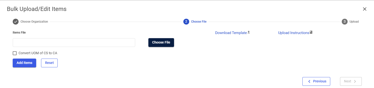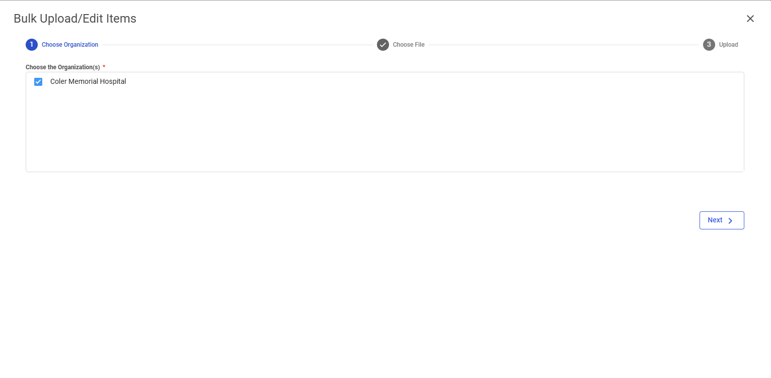 The Bulk Upload/Edit Items window appears. Select the desired organizations in the Choose the Organization(s) field.