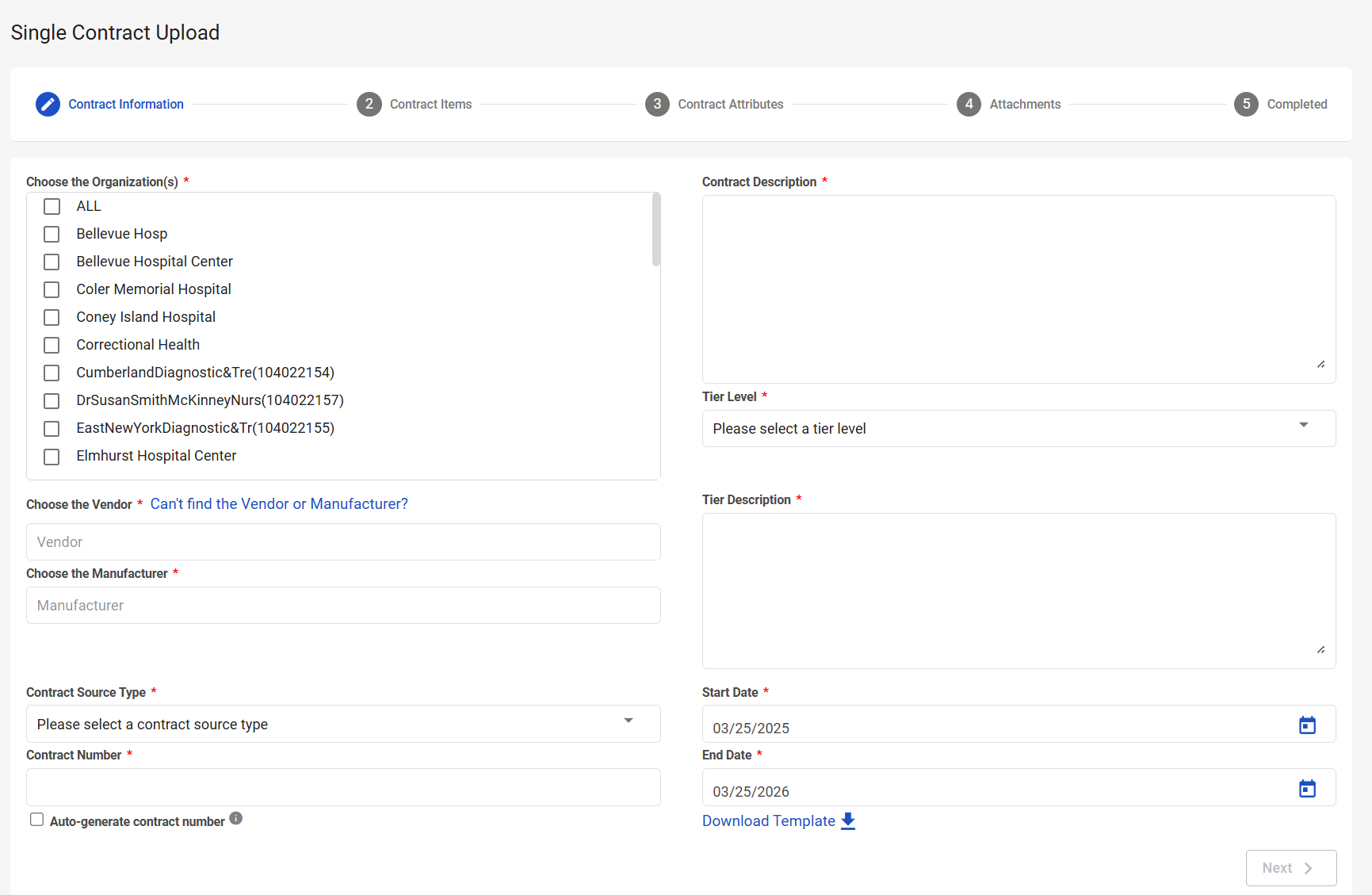 The Contract Information step is the first step in the Single Contract Upload process. In this step, you will identify contract information such as the organization(s), vendor, manufacturer, source type, tier level, and dates associated with the contract. You will also generate the contract number and description.