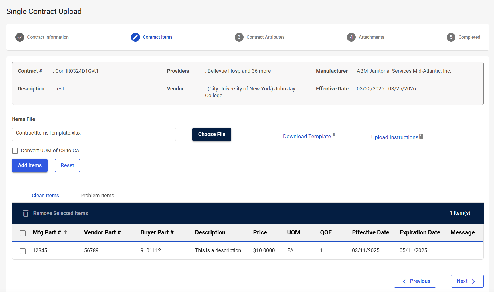 The Contract Items step is the second step in the Single Contract Upload process. In this step, you will upload the Contract Items Template that contains the items you want to associate with the contract.