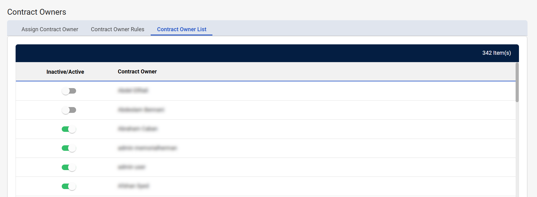 Contract Owner List is the third tab on the Contract Owners screen. This tab displays a list of all CCXpert users that have logged into the application and indicates whether they are marked as eligible to be a contract owner. You can use the Active/Inactive toggle to mark the user as an active or inactive contract owner.