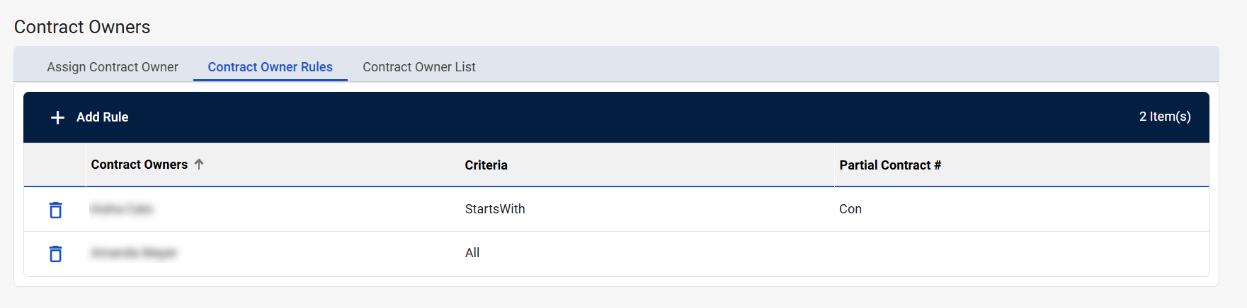 Contract Owner Rules is the second tab on the Contract Owners screen. You can create rules to assign contract owners to new contracts automatically based on specific criteria.