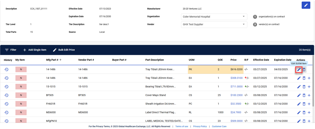 If, in the course of managing a local contract, you want to edit a single item, rather than upload the revised spreadsheet, you can edit a single item on a contract.