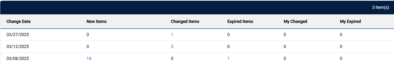 Displays the number of items whose details have been modified in the contract or record. Select an item count to view the full item history. Refer to View Item History for more information. |