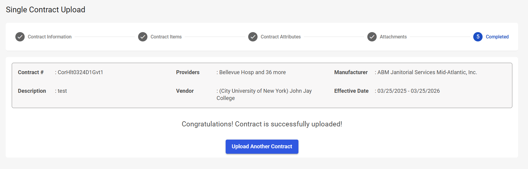 The Completed screen is the fifth and final part of the Single Contract Upload process. This screen presents a confirmation message when the contract is successfully uploaded and the Single Contract Upload process is finished. This screen also gives you the ability to start another contract upload.
