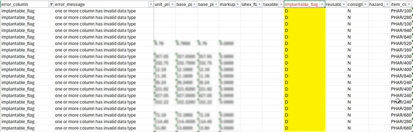 Check the error_column to identify which field has a problem. Review the error_message column to understand the issue. Locate the column with the same name as the field mentioned in the error_column. Review the IM Error Types table below to identify possible solutions to solve for the error. Update your item master file, then re-upload the file.