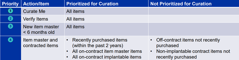 The four priority levels are based on various criteria, such as whether an item is implantable, on- or off-contract,