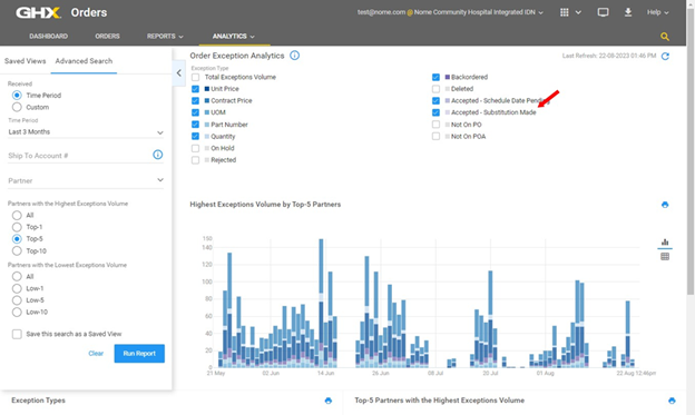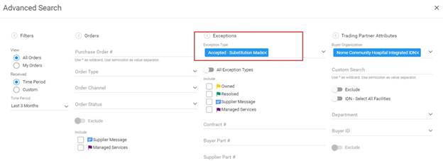 Use the Accepted – Substitution Made filter on the Analytics, Order Exception Analytics page to analyze the exception volume. The report includes exception types, trading partners, and exception trends over time.