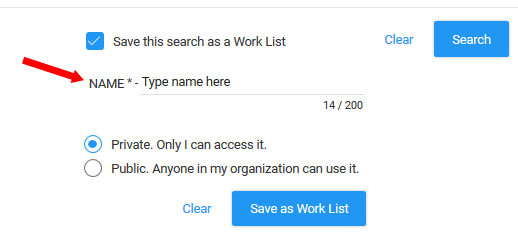 - Click the Save this search as a Work List checkbox. A name field and available options display.