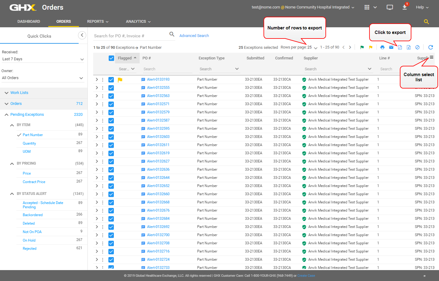 Note: The maximum number of rows in the export is the same as the selected Rows per page, which is located at the top of the results table. In the example above, there will be 25 rows in the exported file.