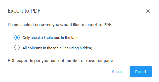 - Only checked columns in the table – Select to include only those columns you have selected from the Column select list (on the right side of the table heading)