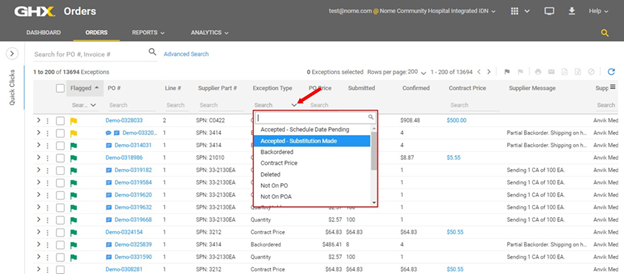 To find exceptions on the Orders page, click the Exception Type column header in the right pane and select the Accepted – Substitution Made option in the list.