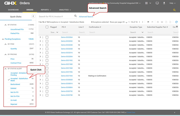 Buyers can identify orders with item substitutions in three places: using a Quick Clicks filter, by searching in Advanced Search, and by selecting the Exception Type column on the Orders page.