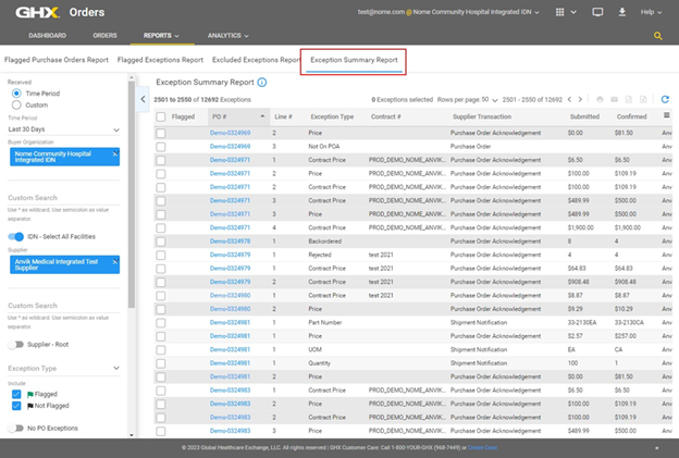 The Exception Summary Report is an historical report. It provides visibility into your item substitutions and serves as a true report outside of the buyer exception management Quick Click work queues. It includes order exception history by date range and exception types such as SPN, UOM, QTY, and price.