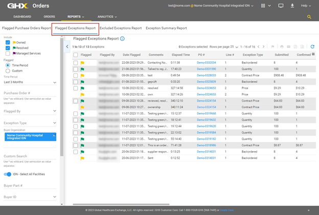 Run the Flagged Exception Report to track management of item substitution exceptions. This report includes exceptions that are open and provides details in near real time. Activity includes pending exceptions that users have marked as owned (yellow flag
