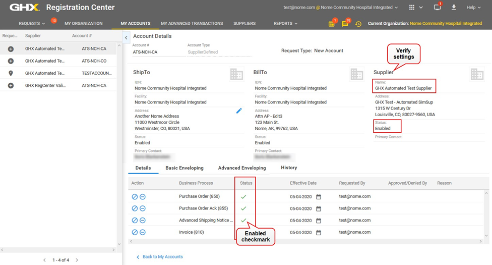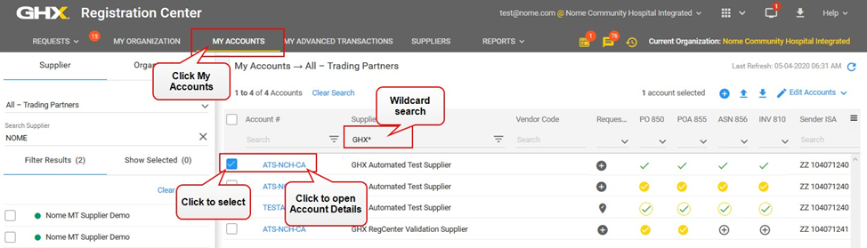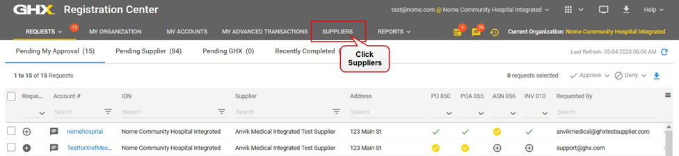 Click the checkbox to the left of the GHX Automated Test Supplier name.