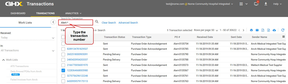 Type the PO number in the search field and press ENTER to search for that transaction.
