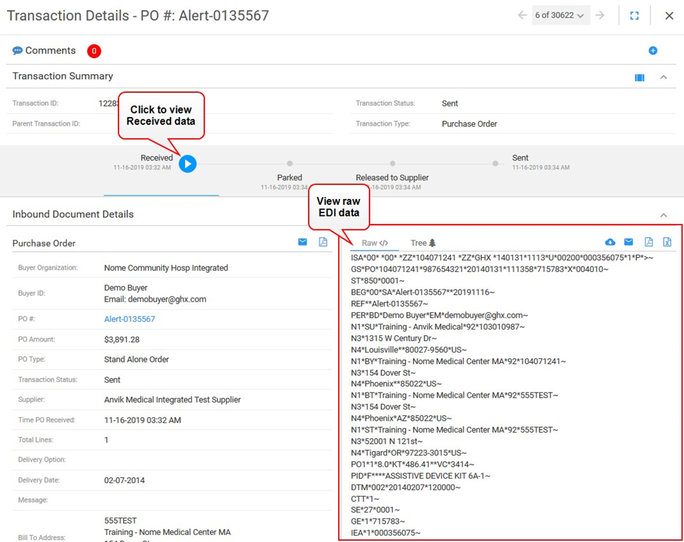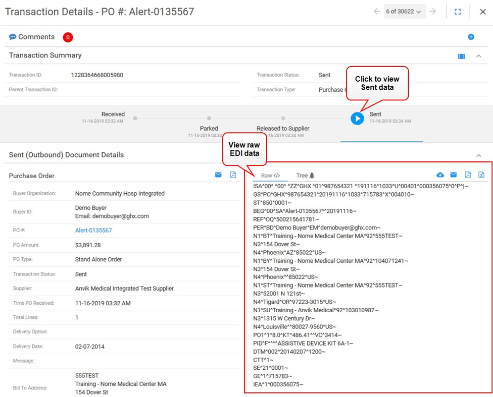 Click the Sent icon to view the raw EDI that was sent to the test supplier.