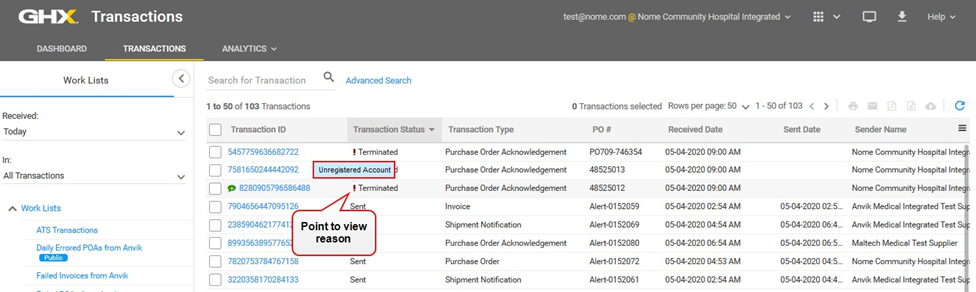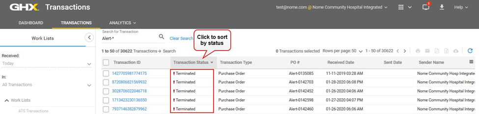 Tip: For transactions with a Terminated status, hover on the exclamation point to view a reason.