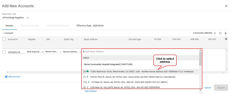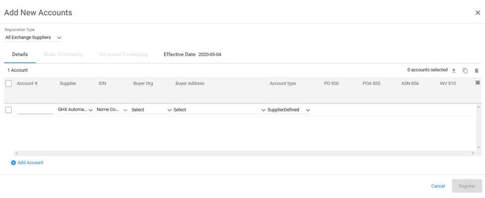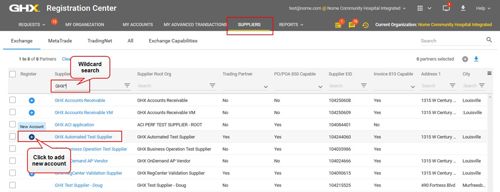 icon to the left of the GHX Automated Test Supplier account. The Add New Accounts dialog box opens.