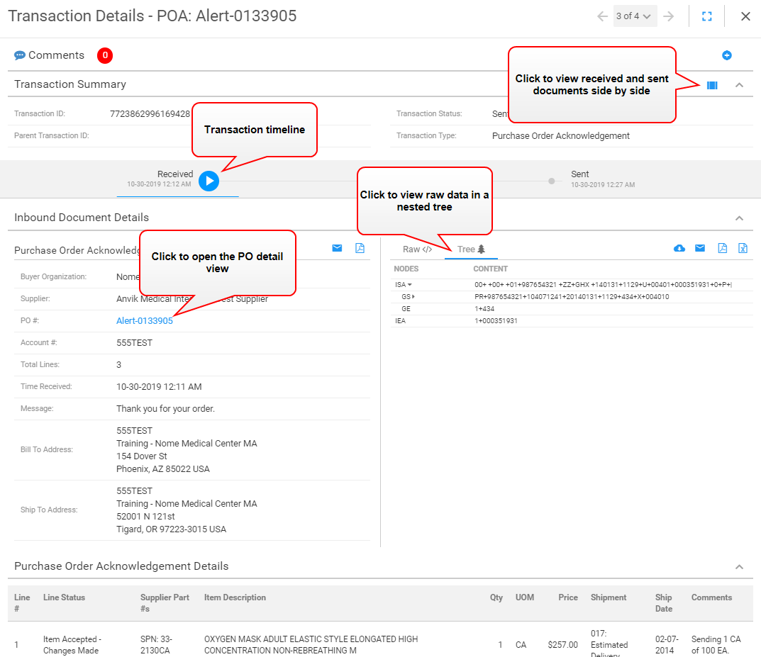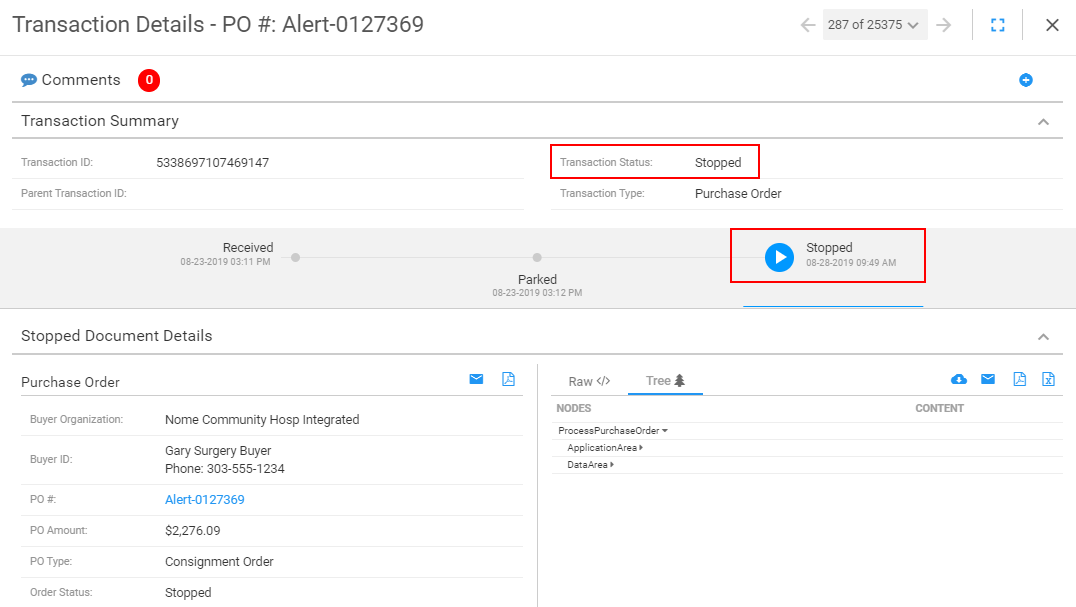 icon identifies whether you are viewing the document that was received (inbound) or sent (outbound).Note: When the document has a Stop on Arrival or Stop on Departure transaction status, see the transaction timeline to view the date and time when the stop action took place.