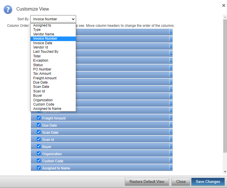- Scroll down and select the checkboxes next to the tab names that will include these columns. Options are My Invoices, All Invoices, and Saved Searches.