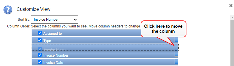 - Click the right side of the column name and drag it to the new position in the list.