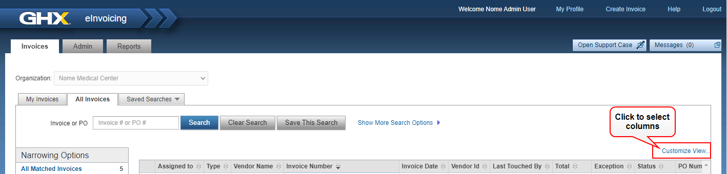 Adjust the column configuration on the invoice tabs so that you see invoice information that's relevant to your daily tasks. The following instructions show you how to customize the view on the My Invoices tab, but you can also customize your view on any of the invoice tabs.