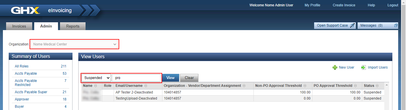 A user's account becomes locked when that user attempts to log into eInvoicing for Providers with an incorrect user name and password combination more than five times. When this occurs, an Admin must unlock the user account by reinstating system access.