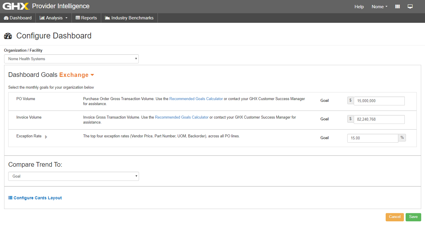 Client administrators can use the following steps to configure some of the settings that show on the GHX Dashboard's Overview pages. Other users can view but not change these settings.