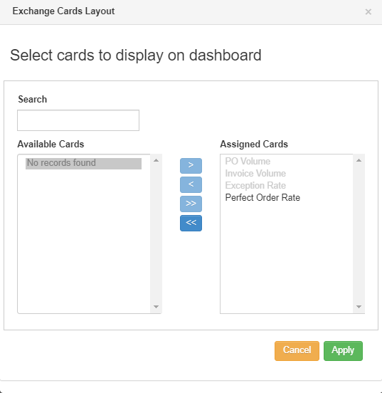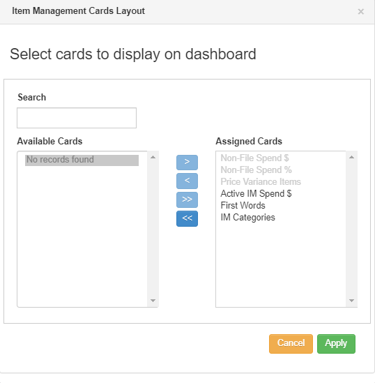 - Select card names and use the arrows to show (move to Assigned Cards) or hide (move to Available Cards) those cards on the Dashboard.