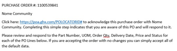 For faxed orders, type https://poa.ghx.com into your web browser and enter the PO Locator ID. The image below shows a sample emailed order.
