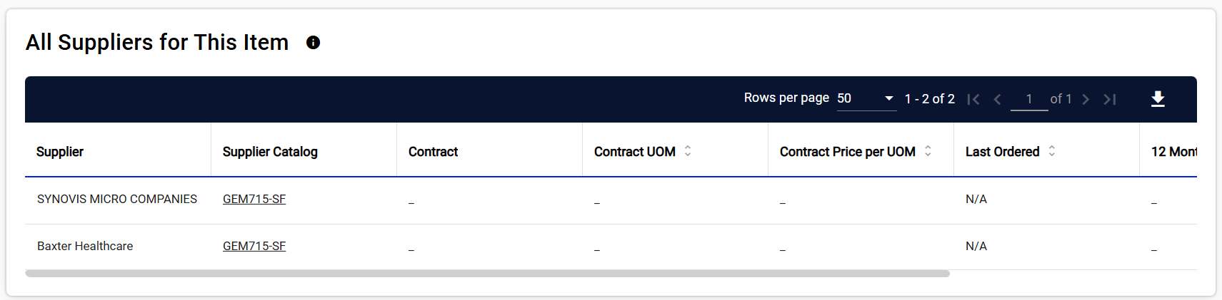 The All Suppliers for This Item section lists each supplier that has sold this item at least once across the GHX network within the past 12 months within your geographic area. It also lists any contracts your company has with the supplier for this item. This information is useful because it can help you locate an alternative supplier for an item.