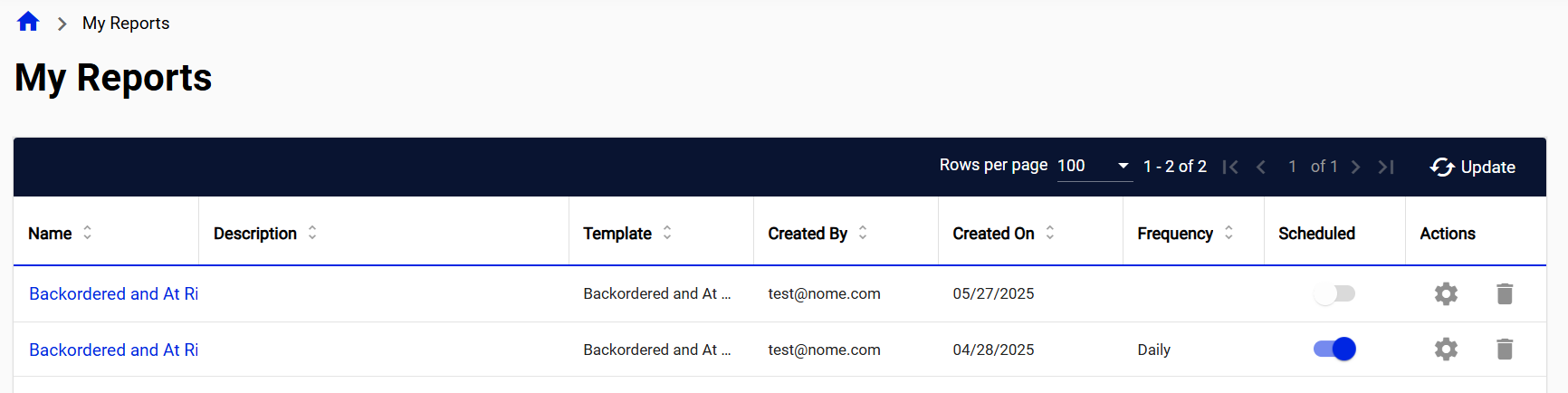 Update | Select to refresh the screen. This is useful if you have recently saved a Resiliency Center report but it is not appearing on the Resiliency Center My Reports screen. |