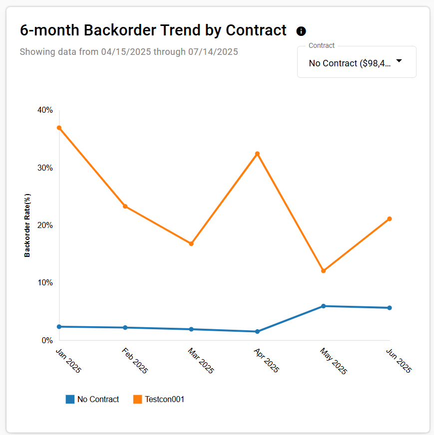 The 6-month Backorder Trend by Contract section visualizes the backorder trends over the past six months, broken down by contract. It helps identify patterns and fluctuations in backorders, aiding in strategic planning and supplier management.