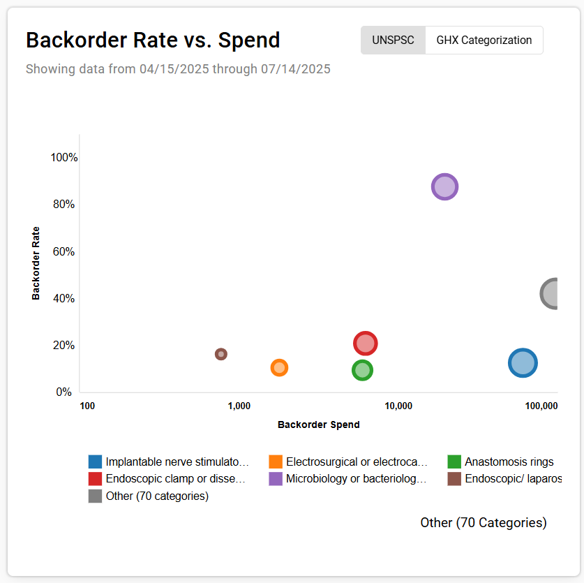 The Backorder Rate vs. Spend section compares the rate of backorders against the total spend over the past six months. It highlights potential supply chain inefficiencies and helps in evaluating supplier reliability and performance. You can view these backorder rates vs. spend for a specific UNSPSC commodity category or GHX product category.