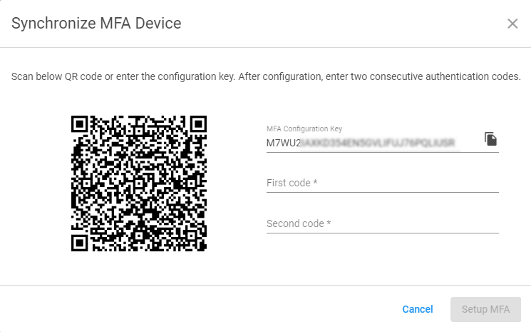 - Scroll down and click Setup MFA. The Synchronize MFA Device dialog box opens.