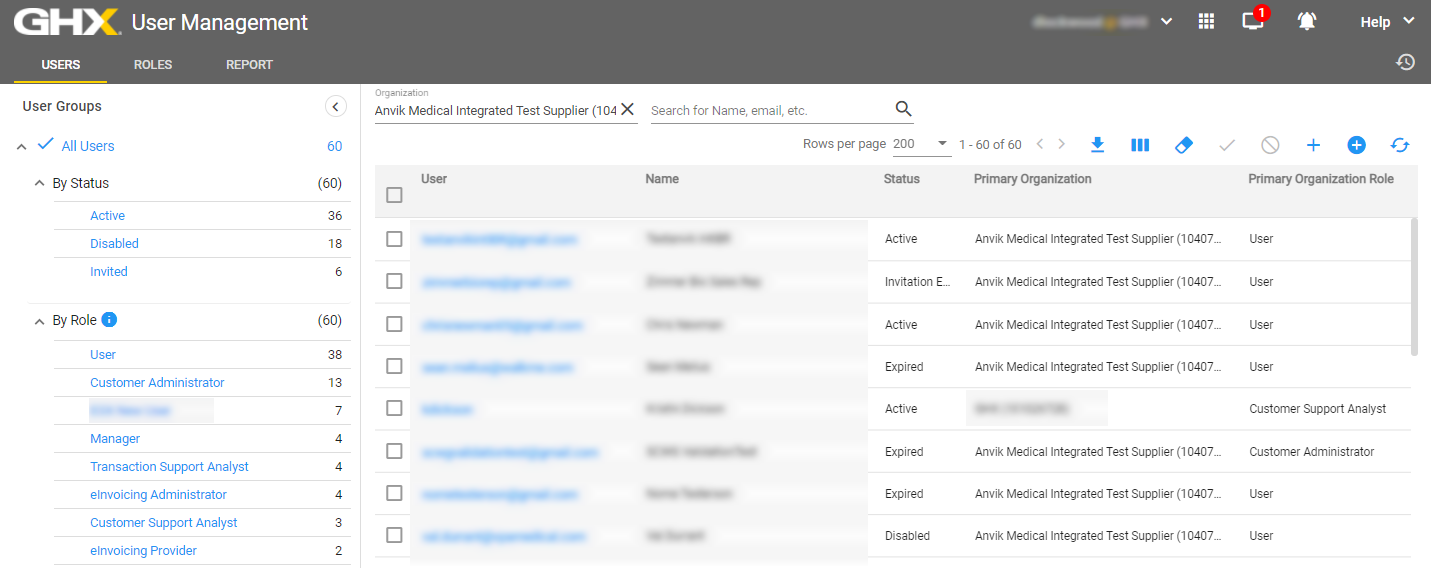 Use the Users page to filter users by status or role in the left pane and search for users by organization, name, and email address in the right pane. You will see only those users who are within your organizational hierarchy.