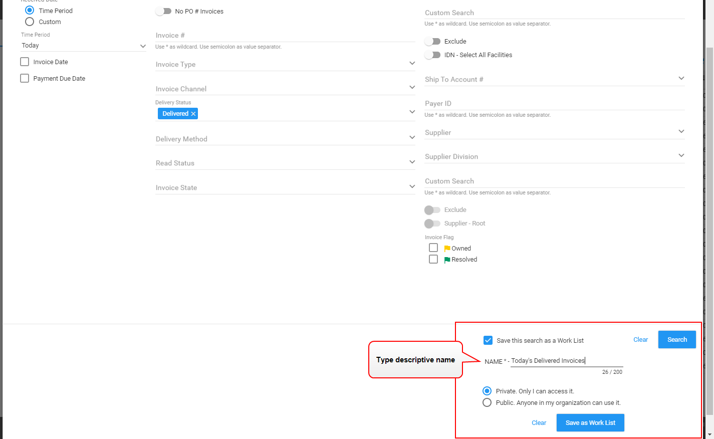 - Scroll down and click the Save this search as a Work List checkbox. A name field and available options display.