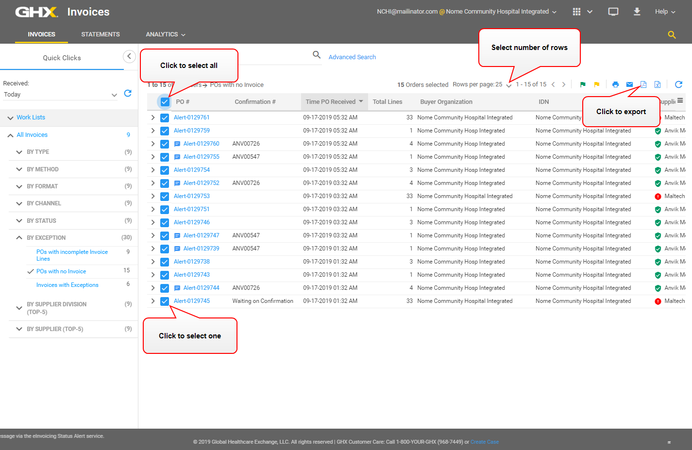 - Click the checkbox to the left of invoices in the table to select them or click the checkbox in the column header to select all invoices in the search results.