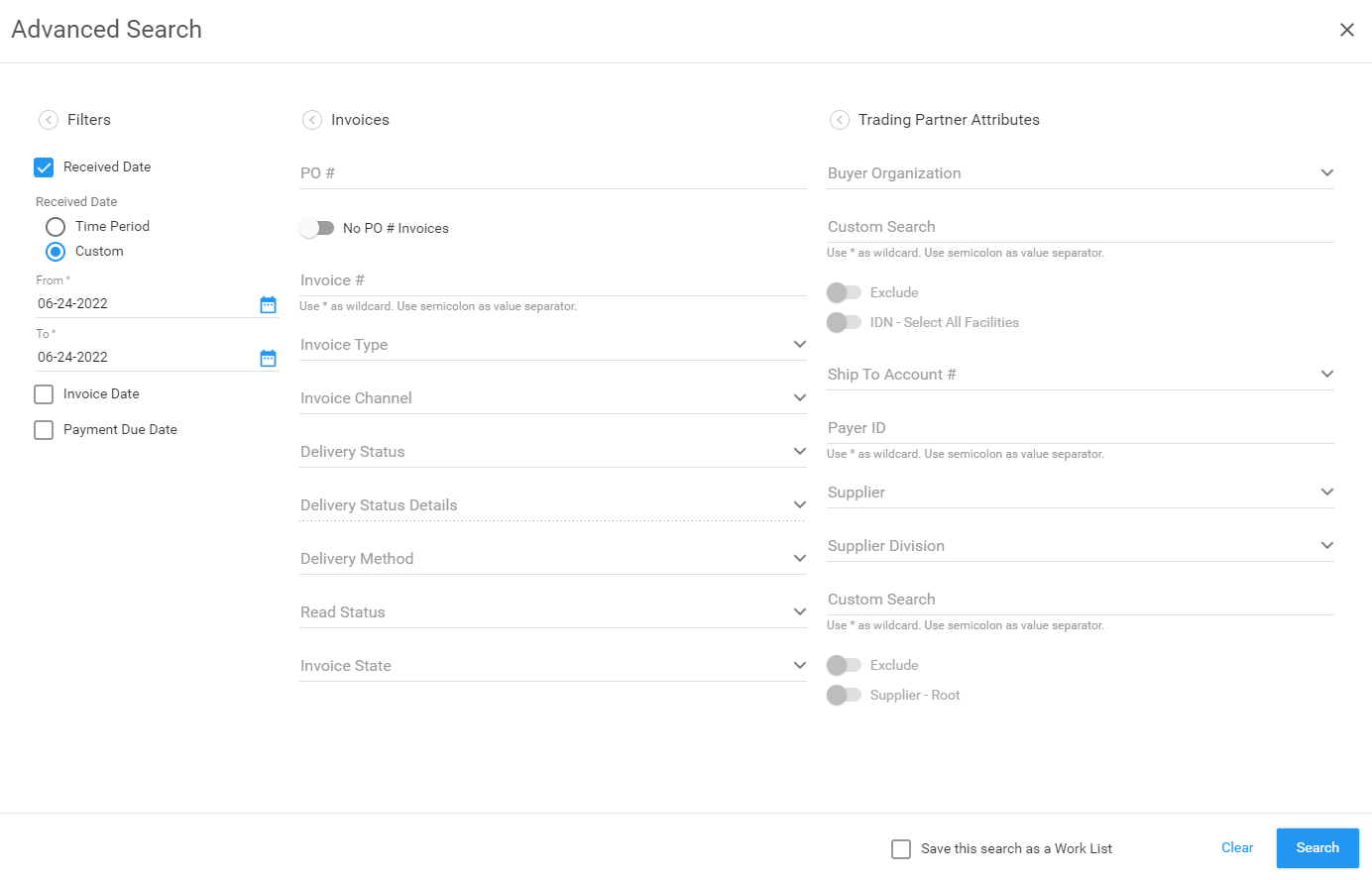 Use the Advanced Search tab to locate invoices using specific data (for example, an invoice number, ship-to account number, and time period when the invoice was received). The autocomplete list includes, at a minimum, all organizations that transacted in the last six months plus those that are included in the selected date range.