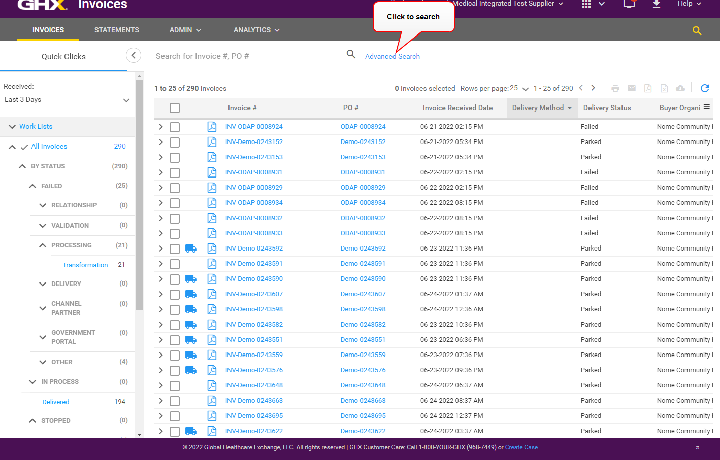 - In process: The invoice was sent and is still in process at GHX (the status isn't Failed or Delivered)